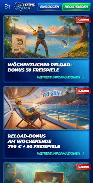 Die regelmäßigen Boni, Turniere und Aktionen von BassBet Casino sind genauso spannend wie die Willkommensboni. Hier ist, was unser Team auf der „Promotions“-Seite des Casinos gefunden hat:- Wöchentlicher Reload: Zahlen Sie von Montag bis Donnerstag ein und erhalten Sie 50 Freispiele.