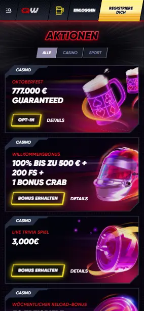 Dies sind die Boni und Aktionen, die wir nach dem Testen des Quickwin Casinos gefunden haben: